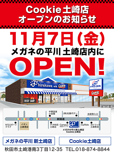 11月7日(金) 新国道にメガネの平川新土崎店が移転openいたします。クッキーも八橋から移転し大きくなってopen!